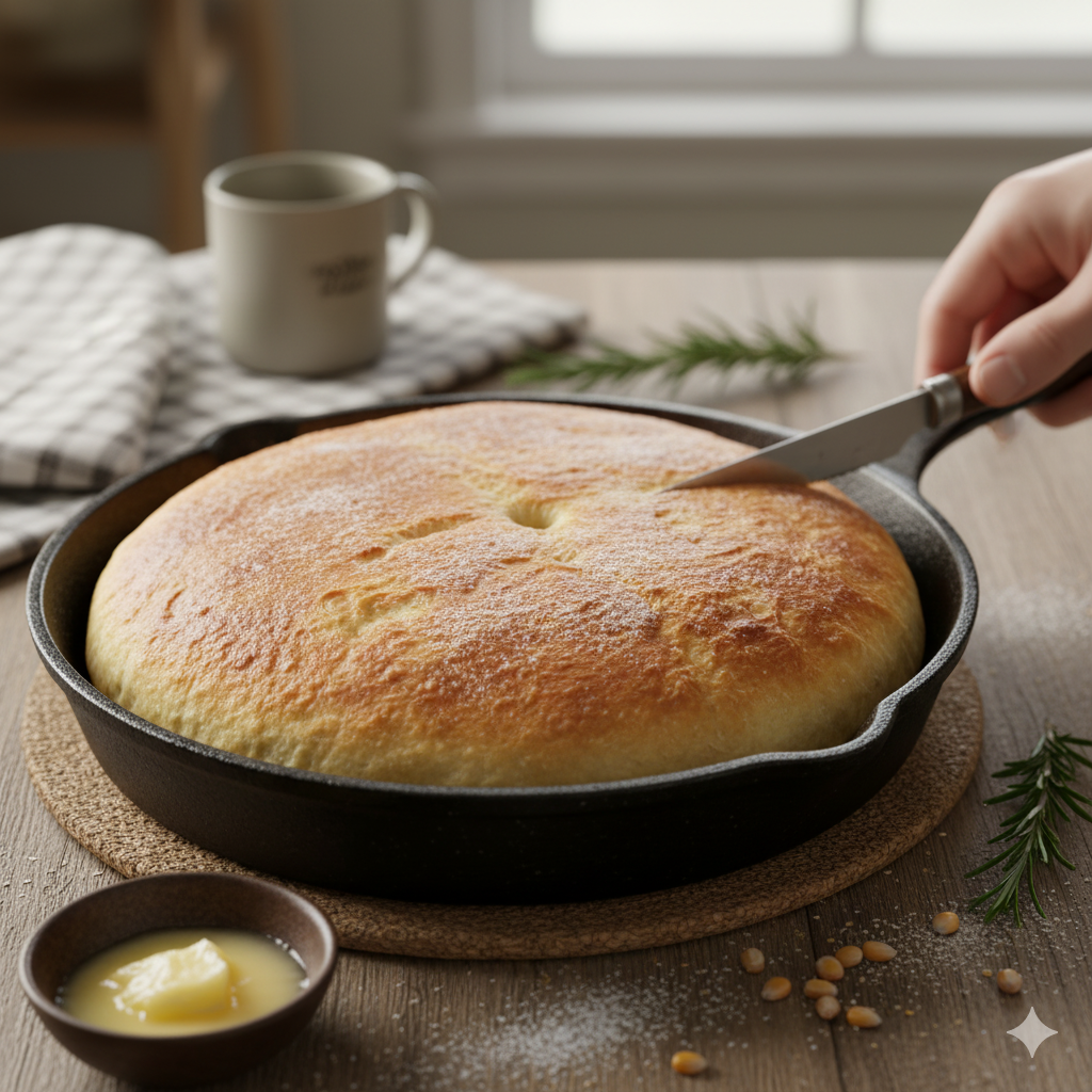 Se eu contar que aprendi este pão de frigideira num acampamento à beira-mar, você acredita? Era madrugada ainda, o céu